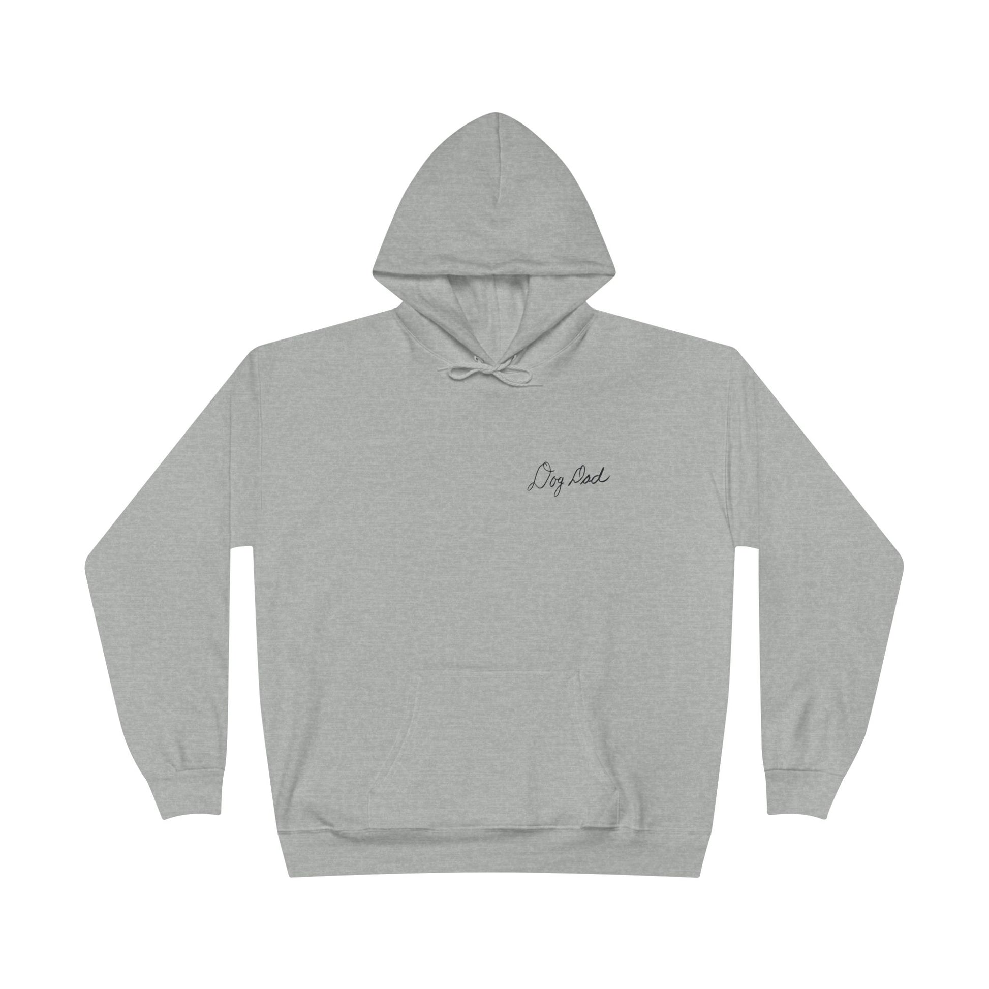 This custom Unisex EcoSmart® Pullover Hoodie Sweatshirt features a unique design with dog dad writing handcrafted by Chewy's 96-year-old grandma. It provides a cozy and personalized touch, perfect for dog lovers looking for a meaningful and stylish piece to wear during family gatherings, holidays, or casual outings.